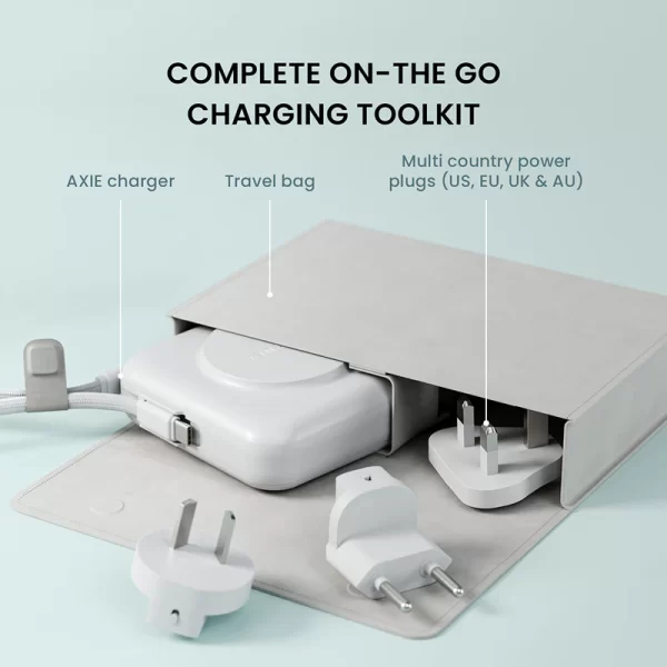 The Axie is a 3-in-1 wireless and USB-C charger/power bank. It is designed to make busy on-the-go charging easy for international travelers and commuters.